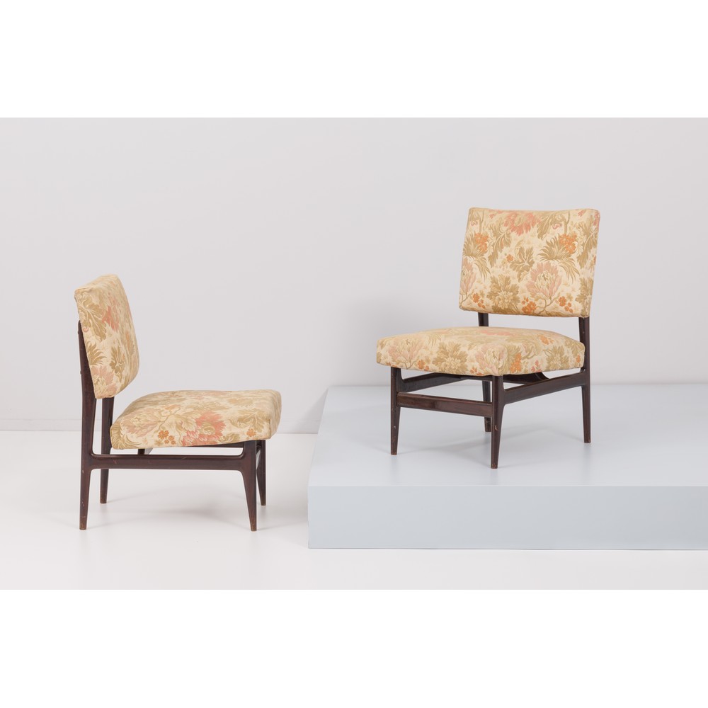 Coppia di poltrone basse, struttura in legno di palissandro seduta e spalliera imbottite e rivestite con tessuto fiorato, piedi conici.