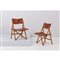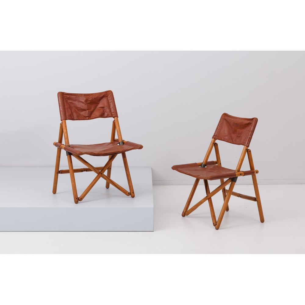 Coppia di sedie pieghevoli modello ‘Navy’ in legno, spalliera e seduta in pelle marrone.