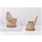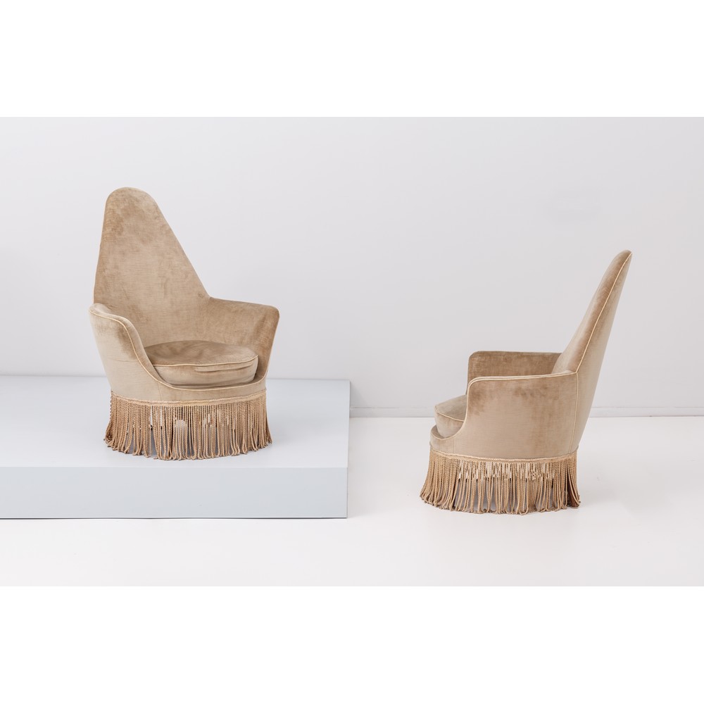 Coppia di poltrone con alto schienale sagomato, seduta circolare, struttura in legno con imbottitura e rivestimento in tessuto beige.