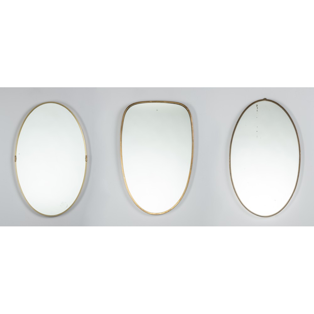 Tre specchi da parete, due ovali e uno a scudo di misure diverse, con cornici in ottone dorato e vetri specchiati.