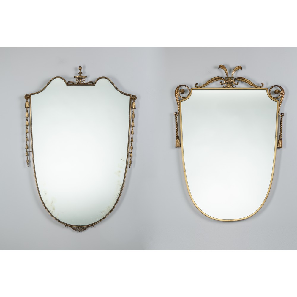Due specchi da parete sagomati, corpo a scudo, cornice in ottone decorato a motivi floreali, vetri specchiati (due punti decorativi dissaldati).