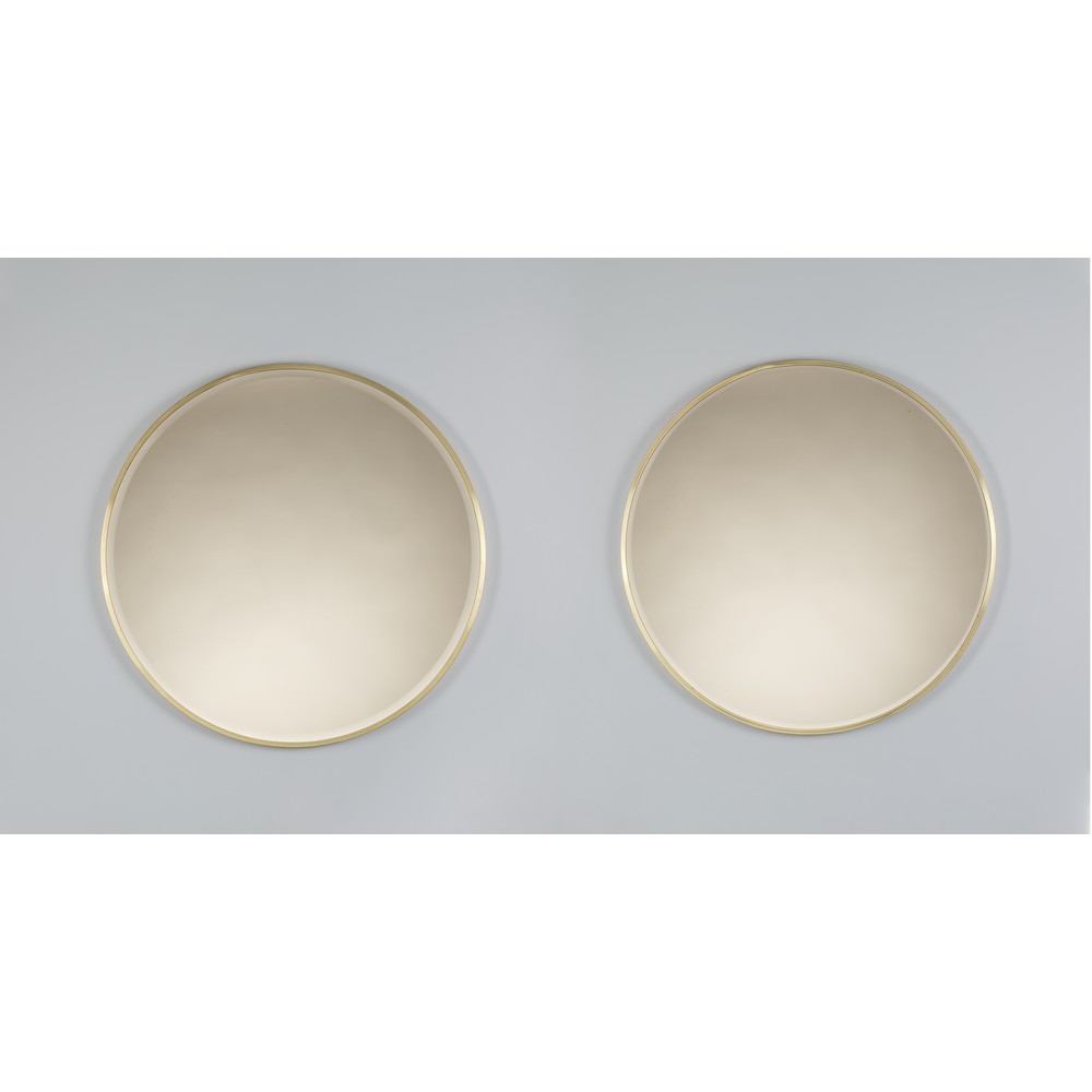 Coppia di specchi da parete, vetri specchiati fumé, corpo circolare, cornice in ottone.
