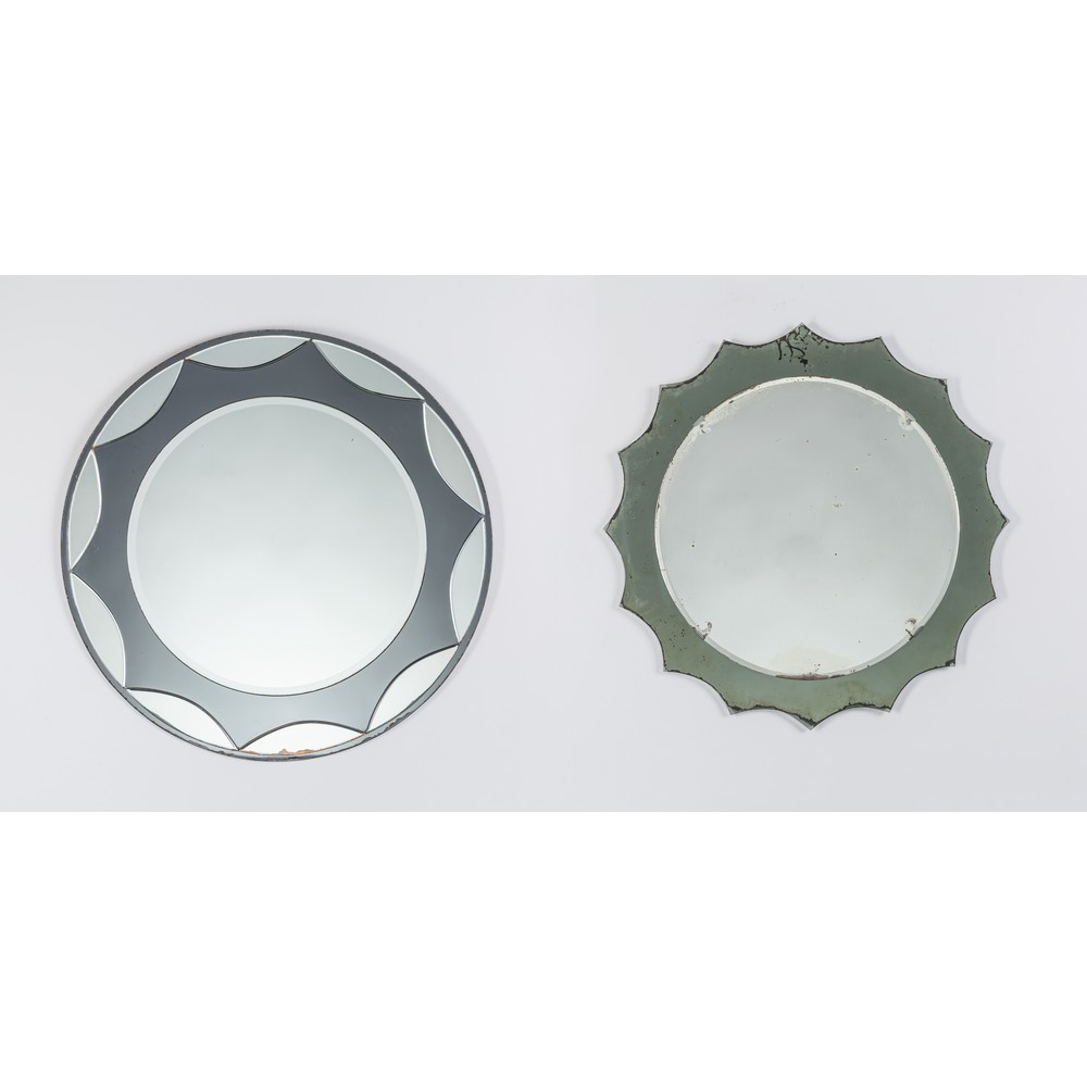 Due specchi da parete, corpo circolare, cornice a raggera in vetro specchiato fumé, vetri specchiati, difetti in uno specchio.