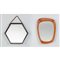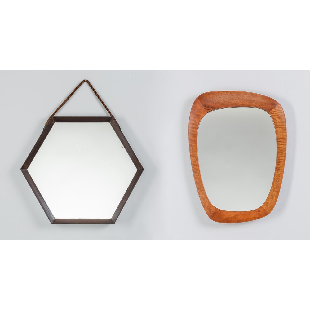 Due specchi da parete, uno esagonale con cornice aggettante in legno ebanizzato e vetro specchiato, l 'altro con corpo irregolare, cornice in legno e vetro specchiato.