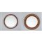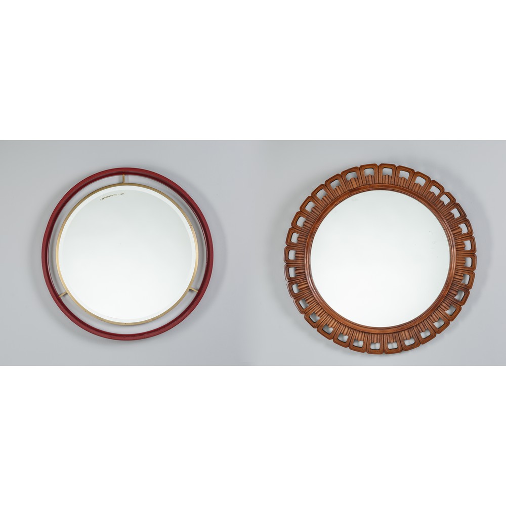 Due specchi da parete a corpo circolare, uno con cornice in legno rosso, ottone e vetro specchiato, l'altro con cornice in legno intagliato.