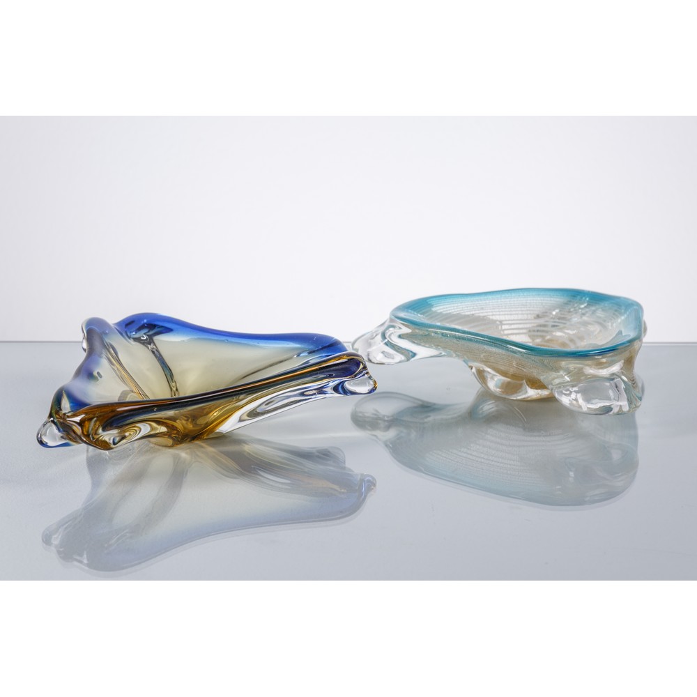Due posaceneri in vetro sommerso, corpo triangolare, nei toni giallo e blu il primo, ambra e azzurro con spirale in vetro lattimo il secondo.