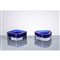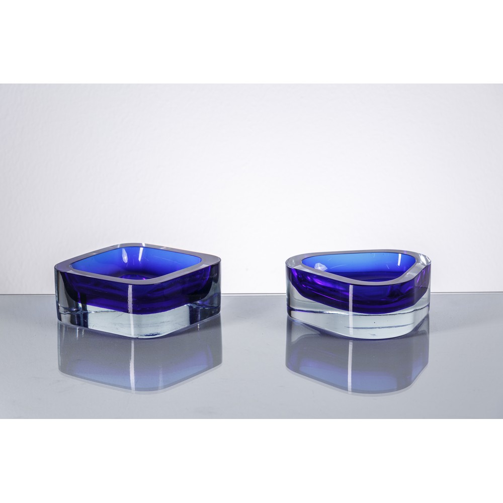 Due posacenere, uno a corpo quadrato e l'altro triangolare, in vetro sommerso blu.