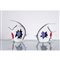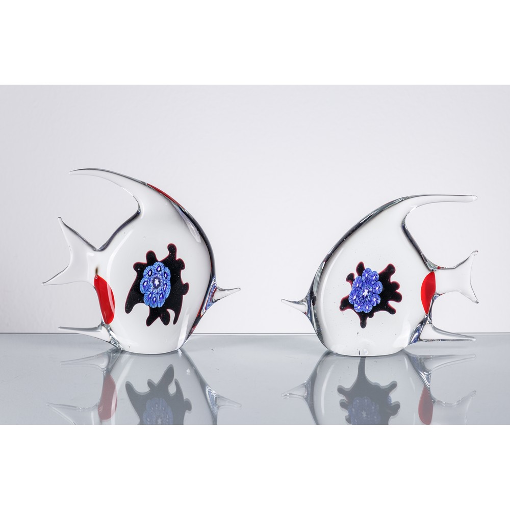 Coppia di pesci tropicali in vetro sommerso incolore, rosso e nero, grande murrina azzurra, etichetta di produzione.
