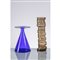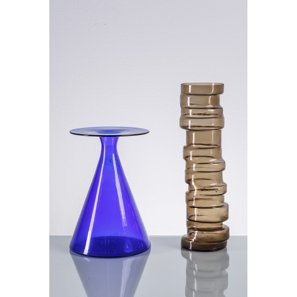 Due vasi Solifleur, uno con corpo conico, bordo piatto ed estroflesso in vetro blu, l'altro cilindrico a cerchi sovrapposti in vetro fumé.