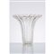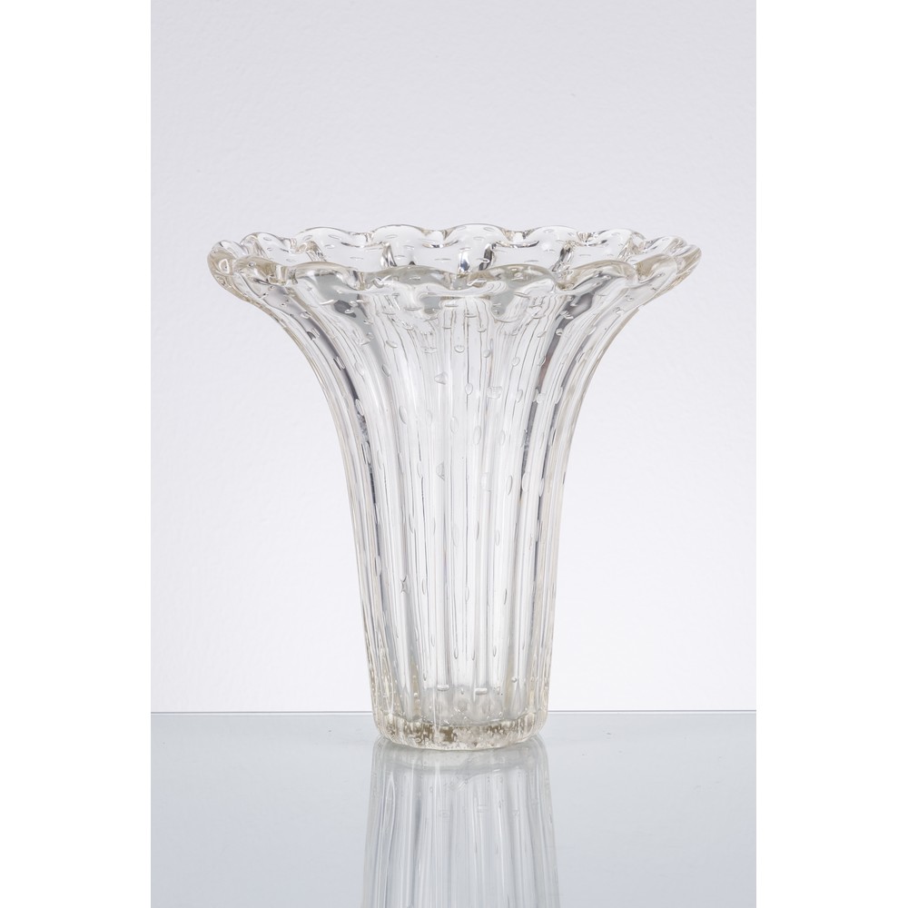 Grande vaso in vetro trasparente costolato e bullicante, corpo a ventaglio, bordo con lobi pronunciati.