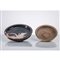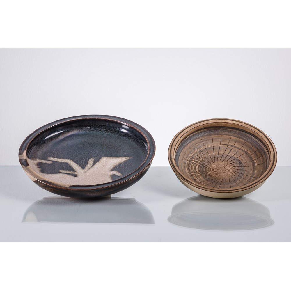 Due centrotavola in ceramica smaltata marrone, una di Faenza decorata a mano, una di Baldelli, entrambe con la sigla della manifattura.