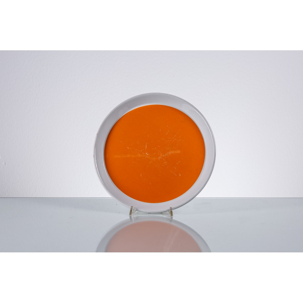 Piatto in ceramica bianco con disco centrale arancione, serie ‘Fantasia Italiana’. Marchio Gio Ponti stampato sul retro. Segni di usura.