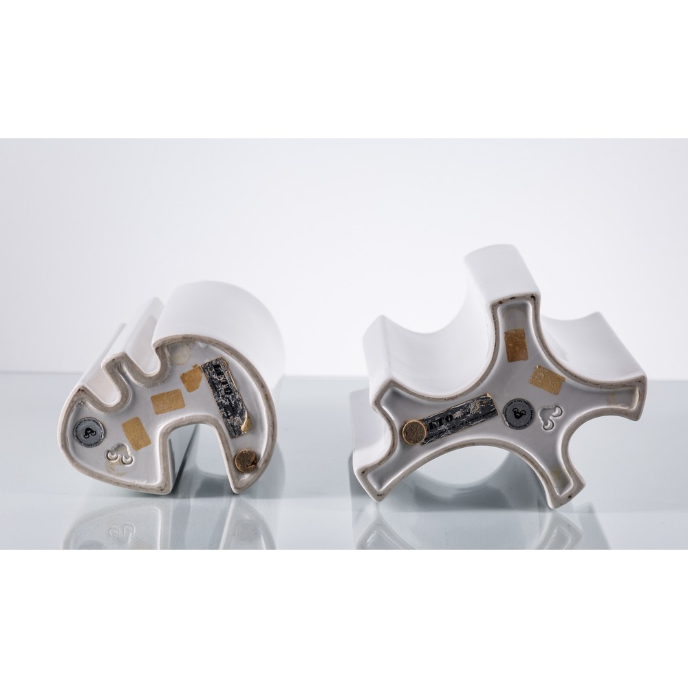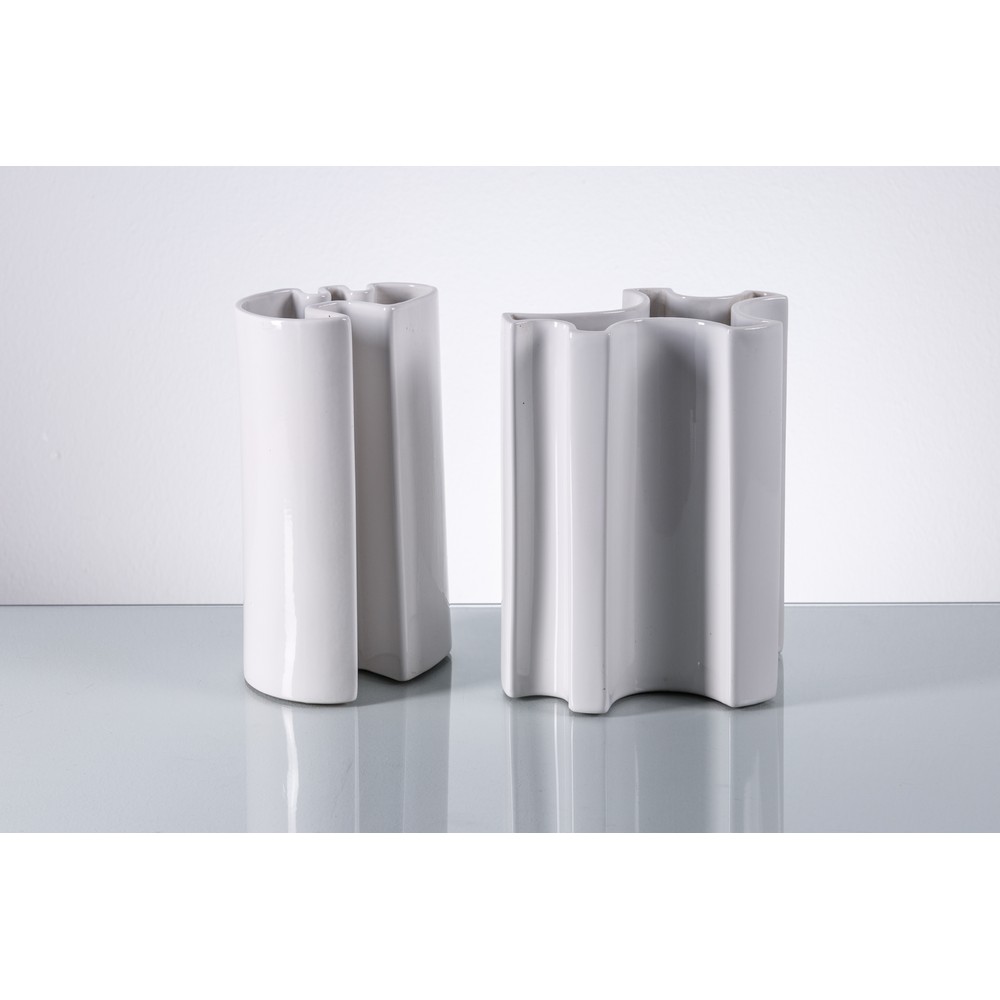 Due vasi modello ‘M6’ e ‘M8’, corpo geometrico a sagoma irregolare in porcellana smaltata bianca.