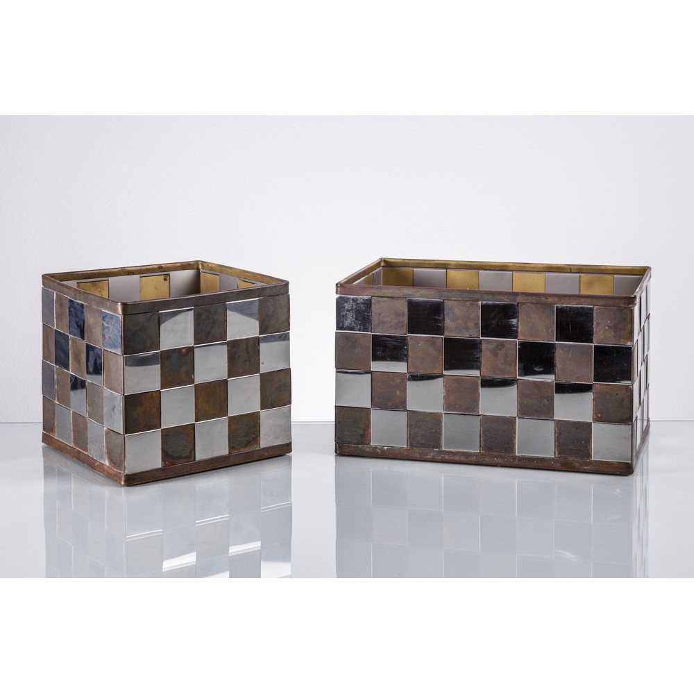 Due cachepot uno quadrato e l’altro rettangolare, lavorazione ad intreccio a fasce d'acciaio e ottone.