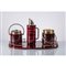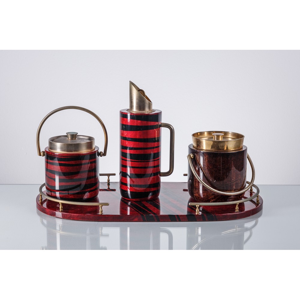 Set da cocktail composto da quattro pezzi in pergamena rossa zebrata, finiture in metallo, etichetta di produzione. Difetti.