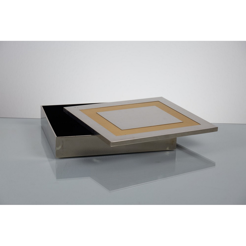 Scatola portagioie in metallo cromato e ottone, corpo quadrato, rivestimento in vetro verniciato nero. Marchio Liwan's Rome Italy.