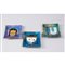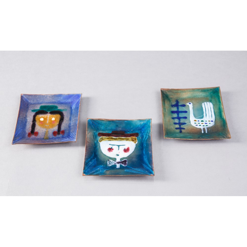 Tre posaceneri policromi in rame smaltato di forma quadrata, raffiguranti due volti e un volatile.