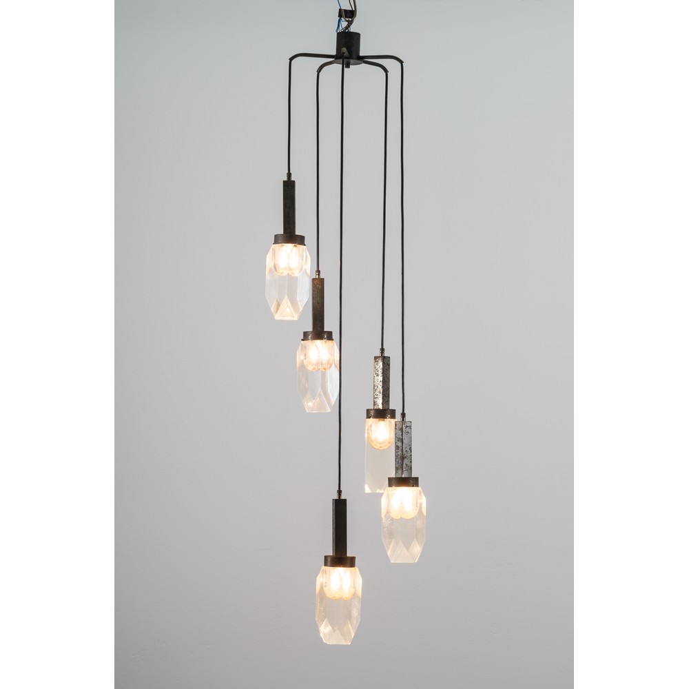 Lampada a sospensione a cinque luci, composta da elementi pendenti sfaccettati in perspex trasparente, segni di usura.
