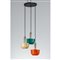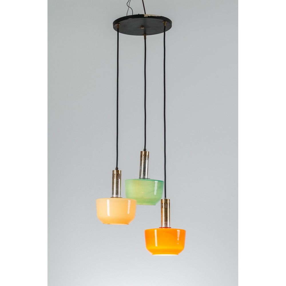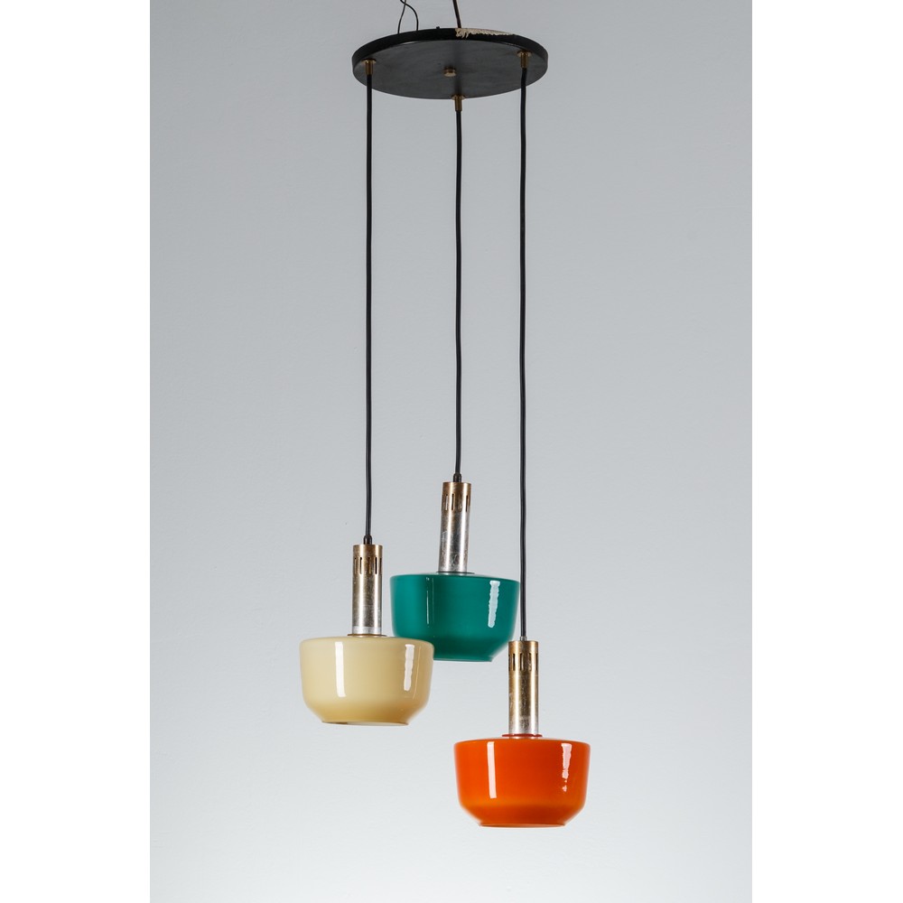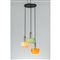 Lampada a sospensione composta da tre corpi sferici ad una luce di differente altezza, diffusori in vetro opalino di tre colorazioni, arancione, verde e giallo.