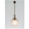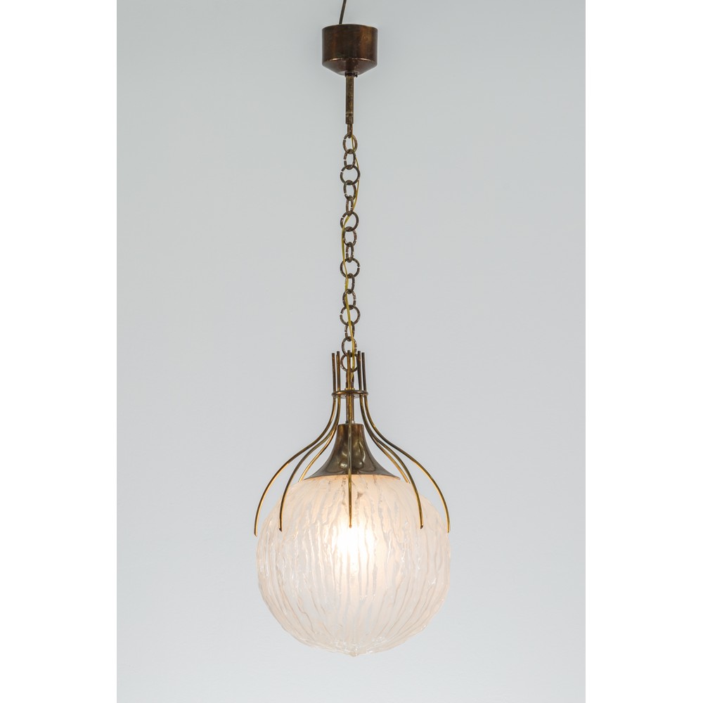 Lampada a sospensione a una luce, struttura in ottone con diffusore sferico in cristallo con motivi informi.