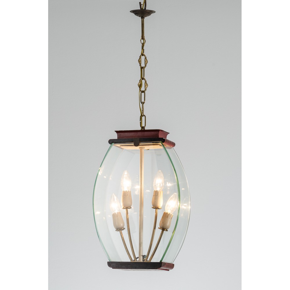 Lampada a sospensione a quattro luci, corpo a lanterna in vetro curvato verde Nilo, legno e metallo laccato, steli in ottone.