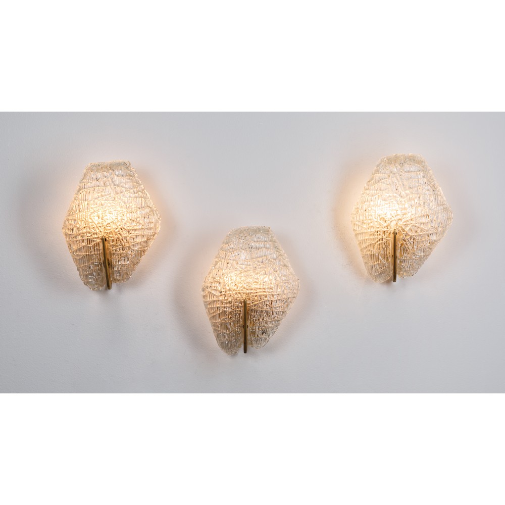Tre lampade da parete ad una luce in vetro di Murano trasparente lavorato a trama tessuto, corpo pentagonale, struttura in ottone.