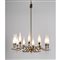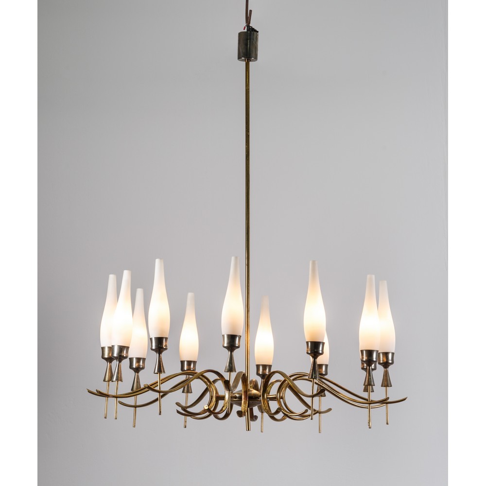Lampada a sospensione a dodici luci, modello ‘12612’ struttura in ottone, bracci curvati con diffusori a candela in vetro opaco.