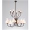 Lampada a sospensione a dodici luci, struttura e bracci in ottone, diffusori in vetro satinato bianco ed elementi fogliacei in ottone.