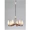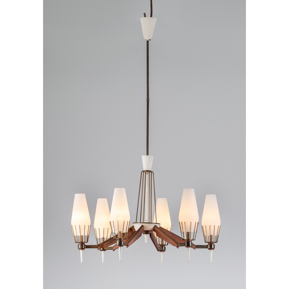 Lampada a sospensione a sei luci, bracci in legno e ottone con diffusori conici in vetro satinato bianco.