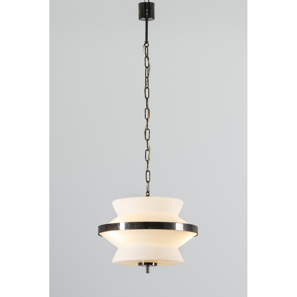 Lampada a sospensione ‘a rocchetto’ con diffusore in vetro opalino satinato e fascia in metallo cromato.