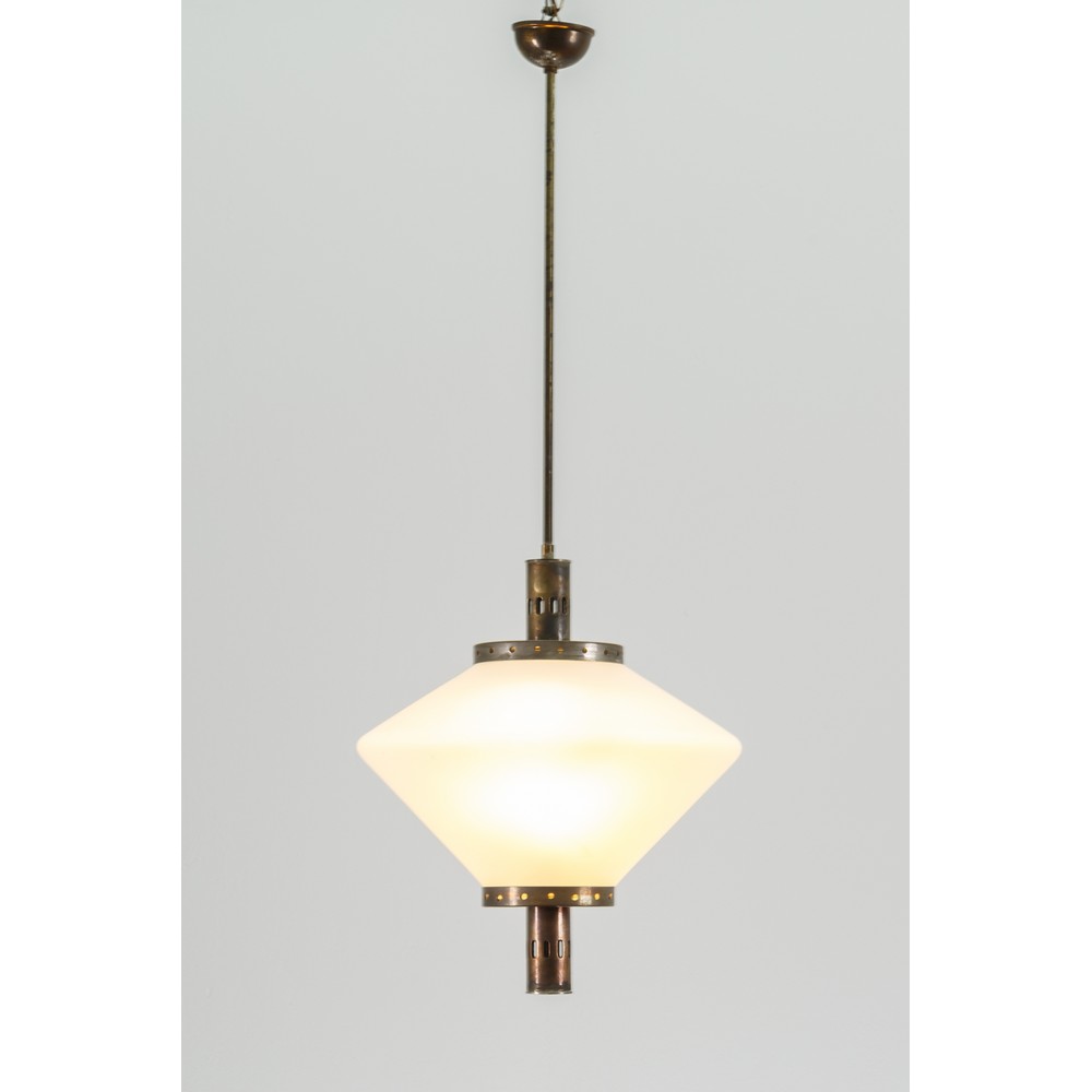 Lampada a sospensione, struttura in ottone, diffusore romboidale in vetro opalino bianco.