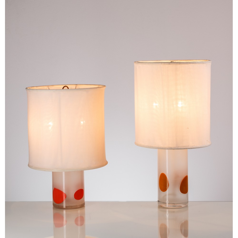Due lampade da tavolo a due luci di differente altezza, corpo cilindrico in vetro trasparente decorato con pois rossi (la più piccola) e gialli (la più grande), paralume in tessuto bianco.