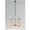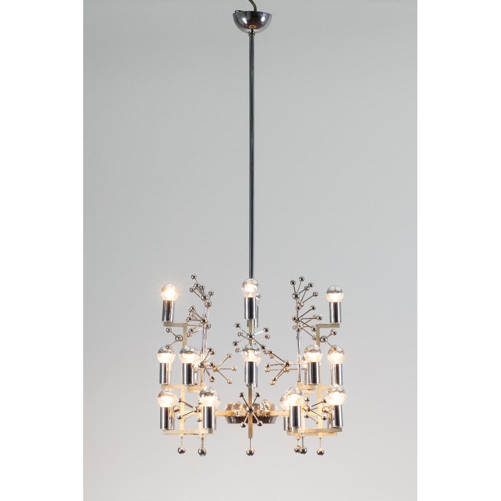 Lampada a sospensione a venti luci in metallo laccato e acciaio cromato, decori a piccole sfere in metallo cromato, parte di etichetta adesiva “Stilnovo” su un portalampada.