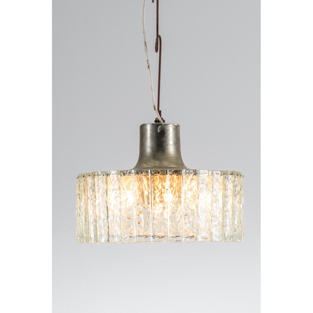 Lampada a sospensione, corpo circolare in ottone e cristallo scalpellato di forte spessore verde Nilo, diffusore in vetro opalino.