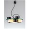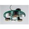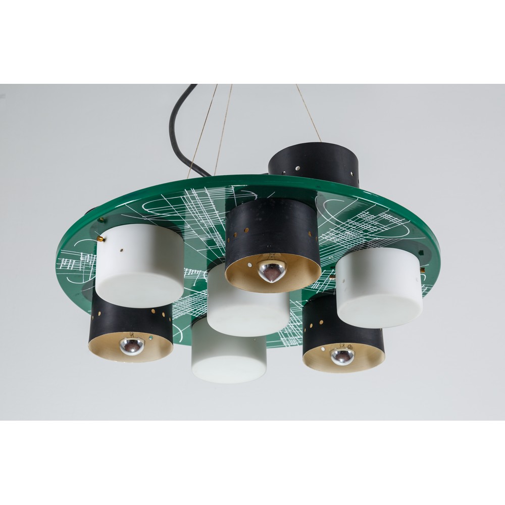 Lampada a sospensione, corpo a disco in metallo laccato verde a dieci luci (7+3), diffusori cilindrici in metallo nero e vetro satinato bianco.