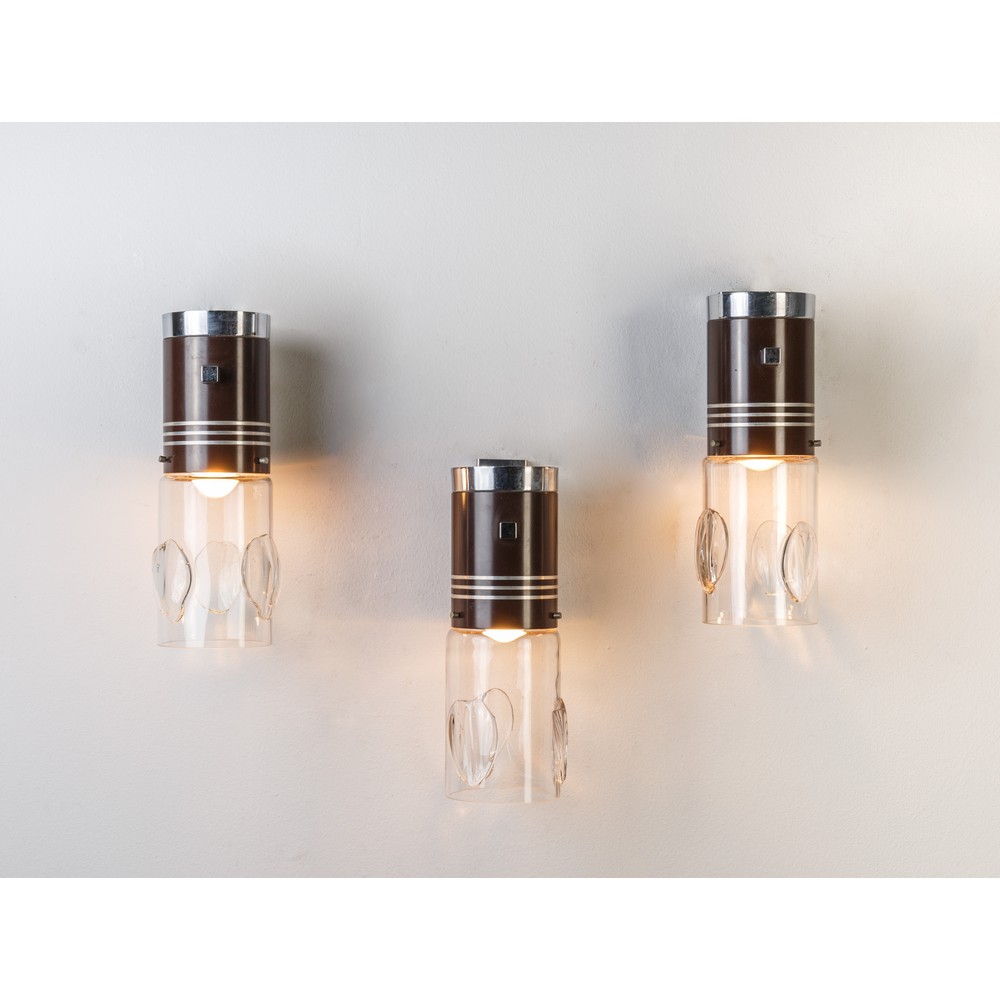 Tre lampade da parete ad una luce, struttura in metallo cromato e verniciato, corpo cilindrico, diffusore in vetro trasparente decorato con grosse gocce di pasta di vetro trasparente.
