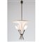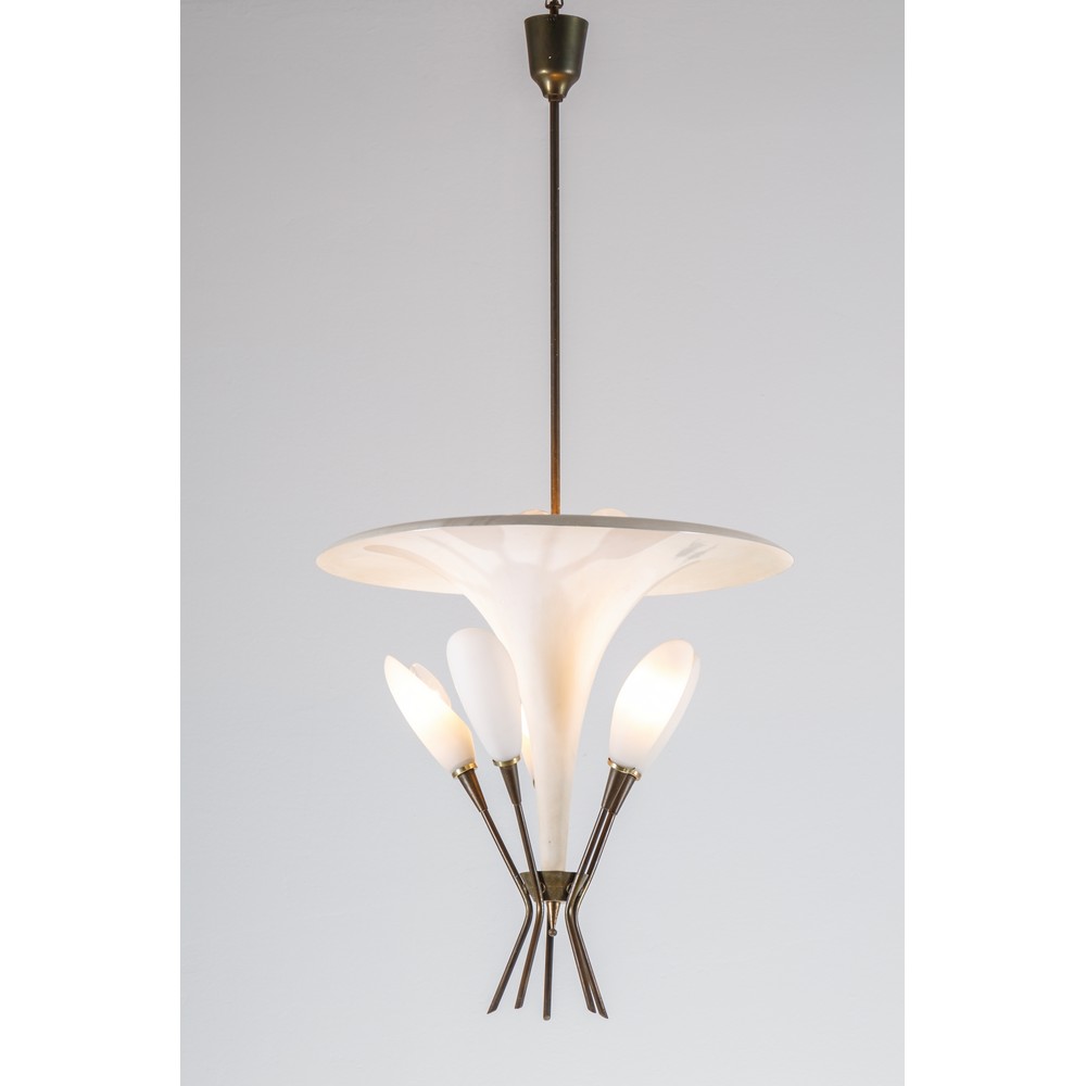 Lampada a sospensione a otto luci (5+3), struttura in ottone con cinque diffusori in vetro satinato bianco, diffusore centrale in alluminio laccato bianco.