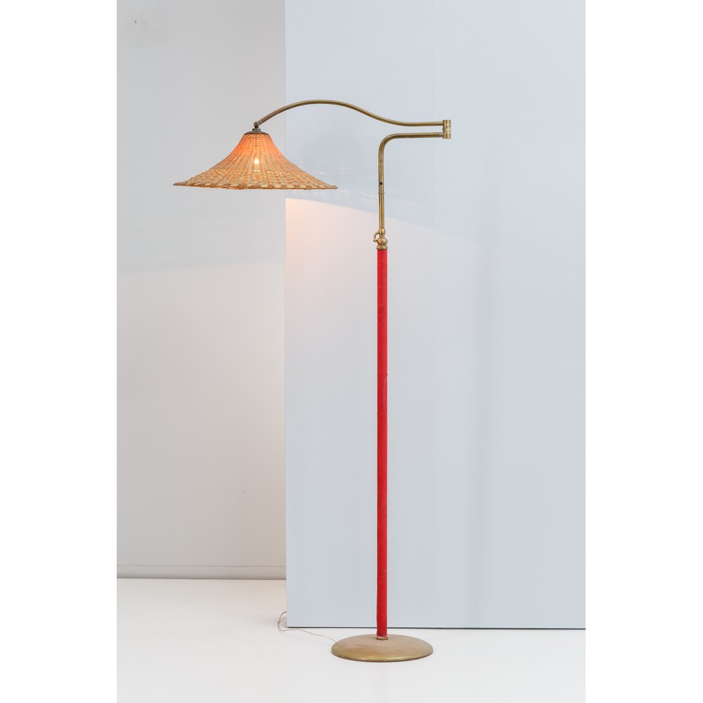 Lampada da terra ad una luce, base circolare, stelo estendibile in metallo verniciato rosso, braccio snodabile rotante in ottone, diffusore in midollino.