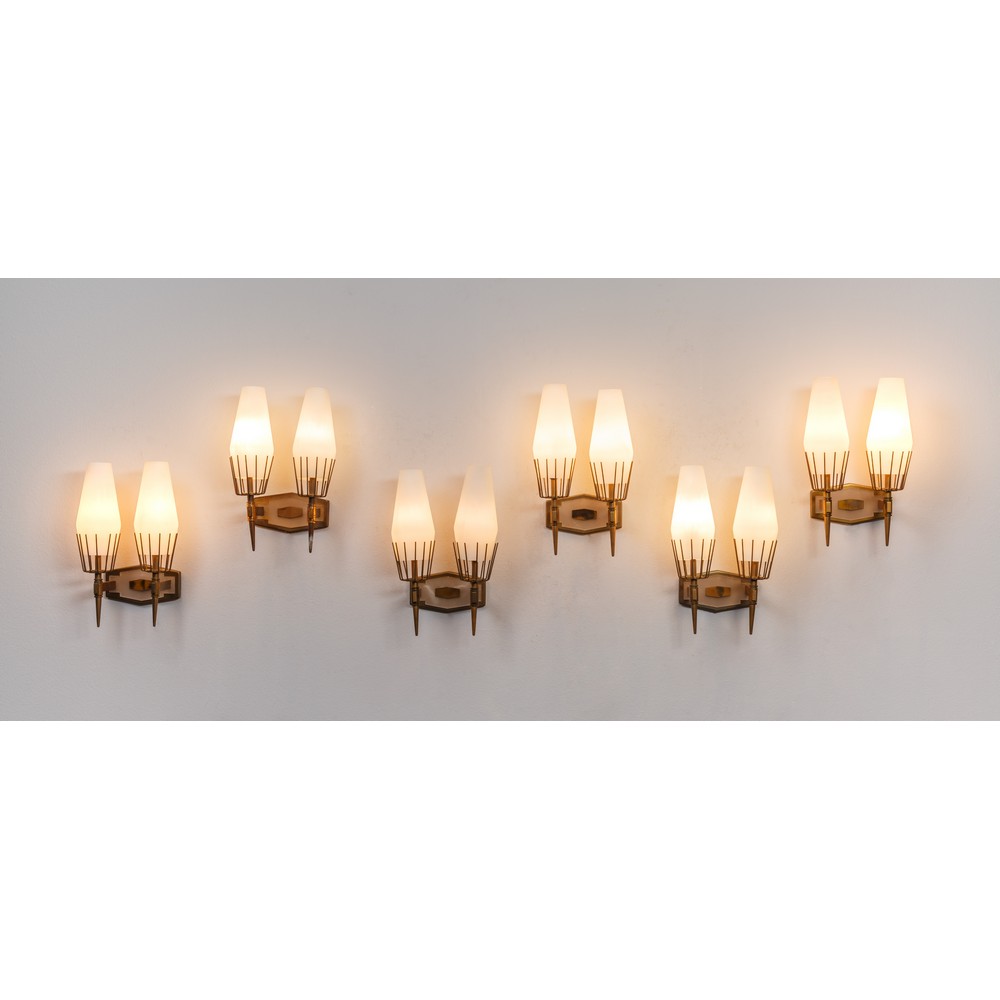 Sei lampade da parete a due luci, struttura in ottone, diffusori a prisma in vetro bianco.