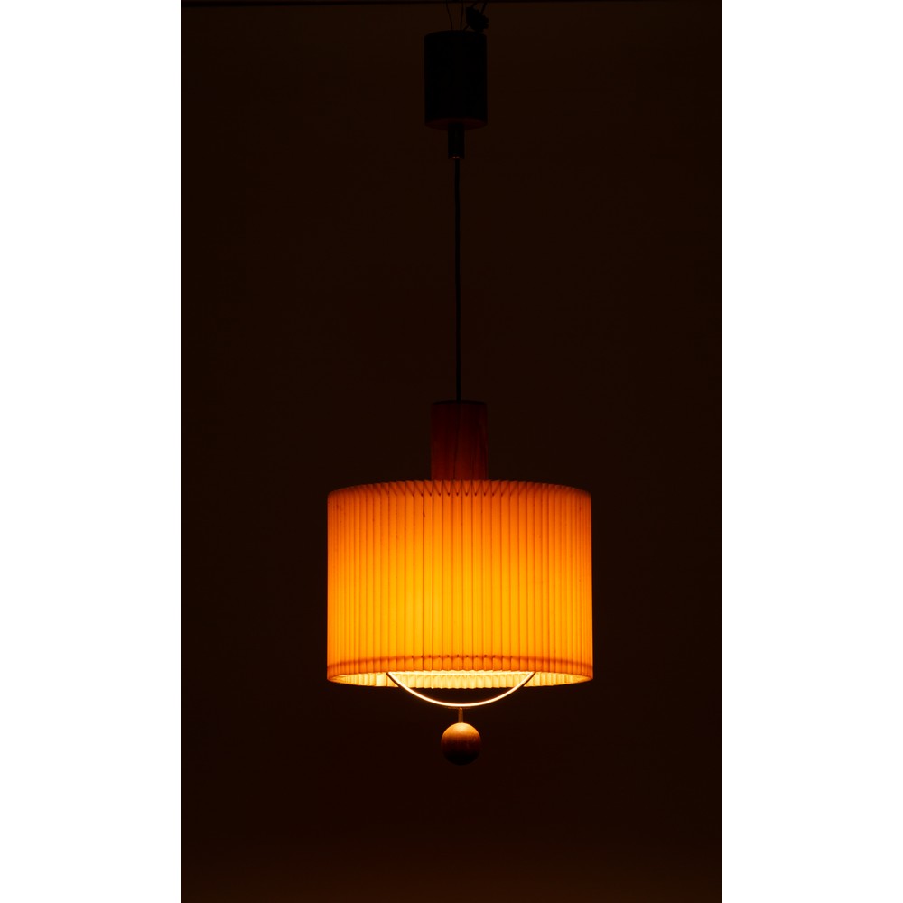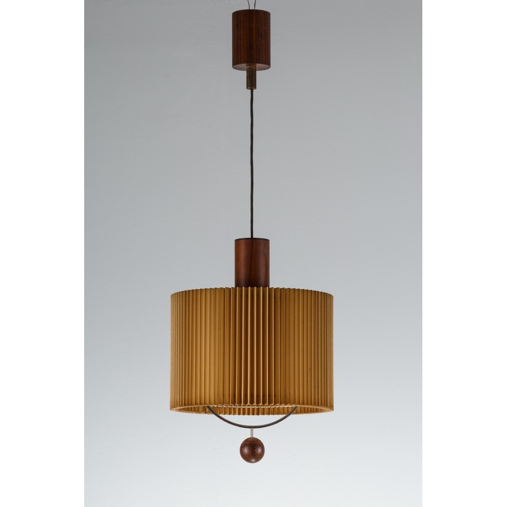 Lampada a sospensione ‘sali-scendi’, struttura in legno e metallo, diffusore luminoso circolare in pergamena plissettata.