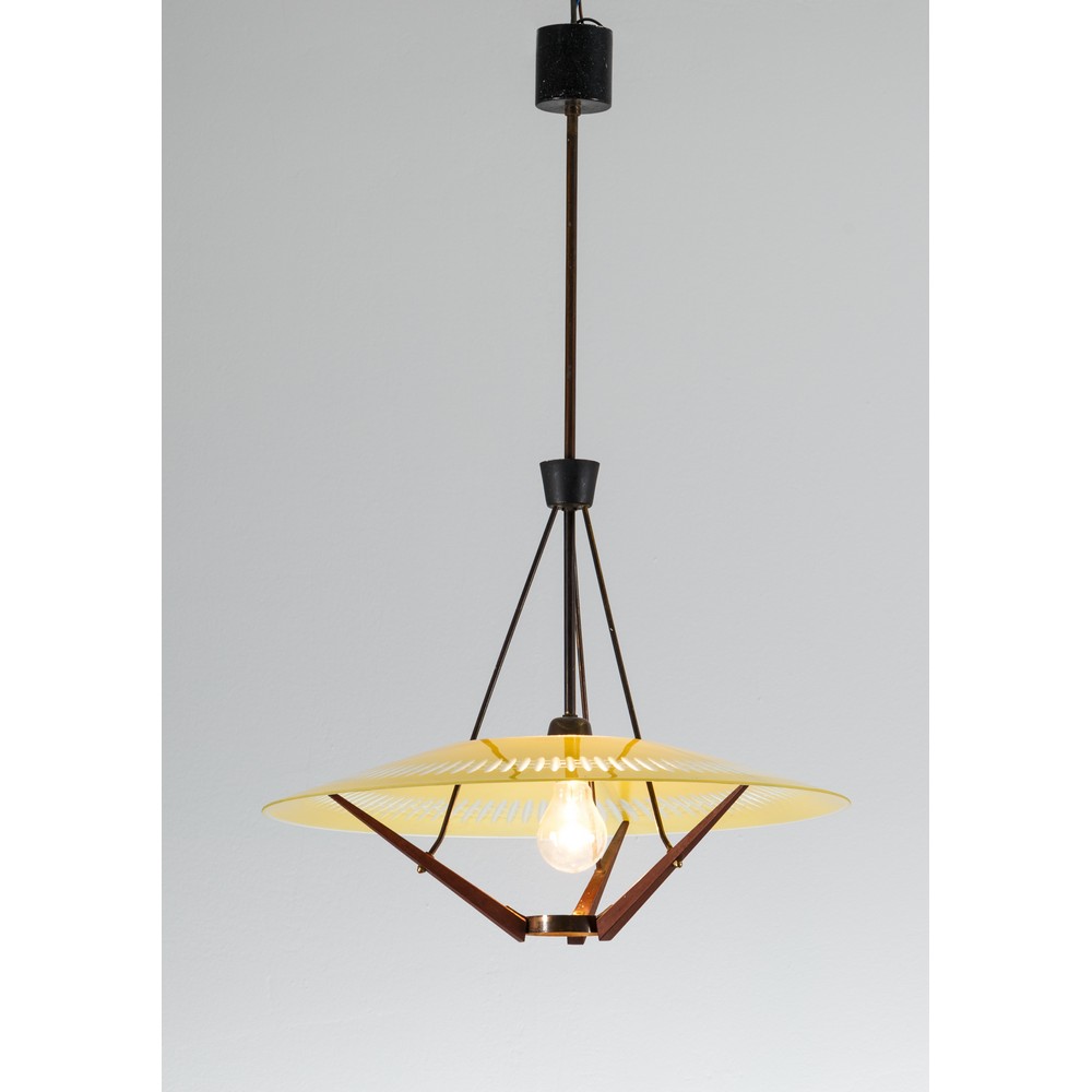 Lampada a sospensione ad una luce, struttura in ottone e legno, diffusore circolare in vetro giallo.