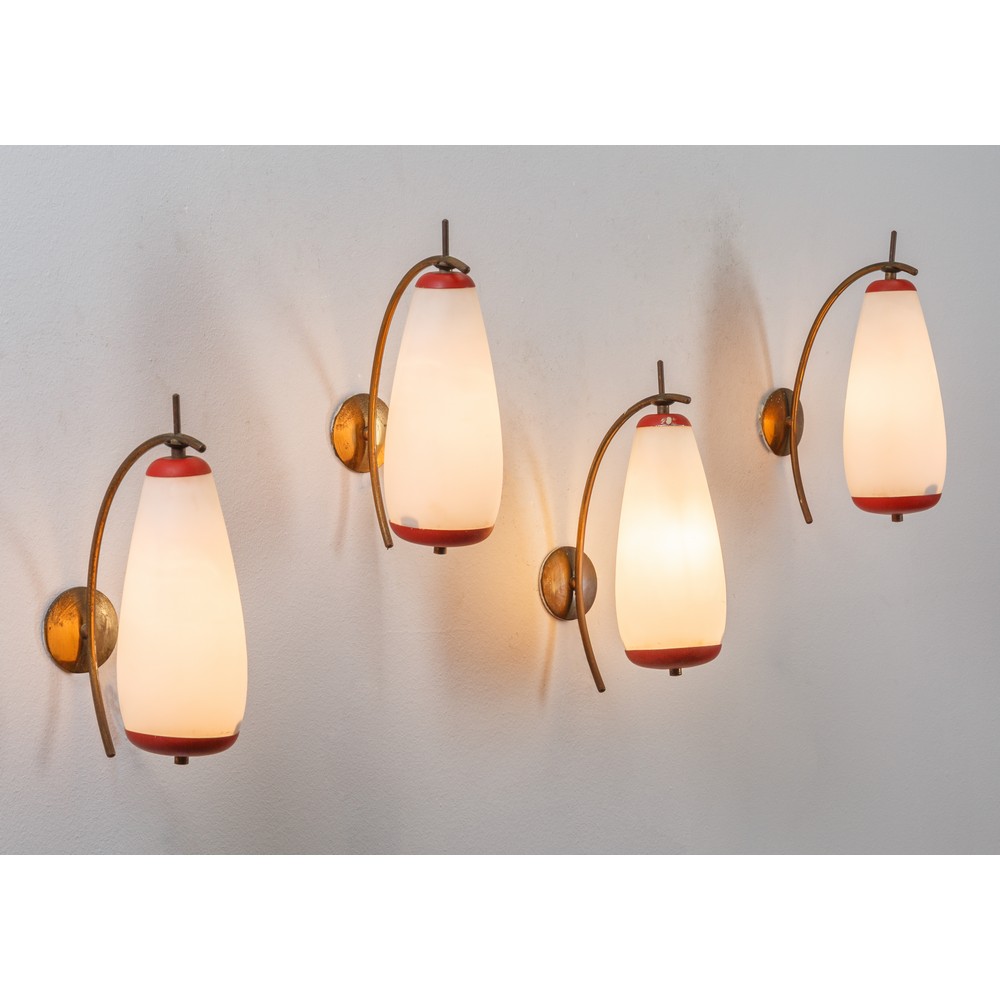 Quattro lampade da parete a una luce, pendenti, struttura in ottone e metallo laccato rosso, diffusore in vetro satinato bianco.