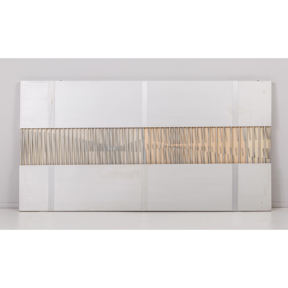 Grande installazione su pannello in legno rivestito in lamine e tondini d'alluminio su sfondo bianco e crema, opera sulla rifrazione delle onde sonore. Firma ‘Salvatore’ sul retro. (Probabilmente esposta alla biennale di Venezia, anni '60).