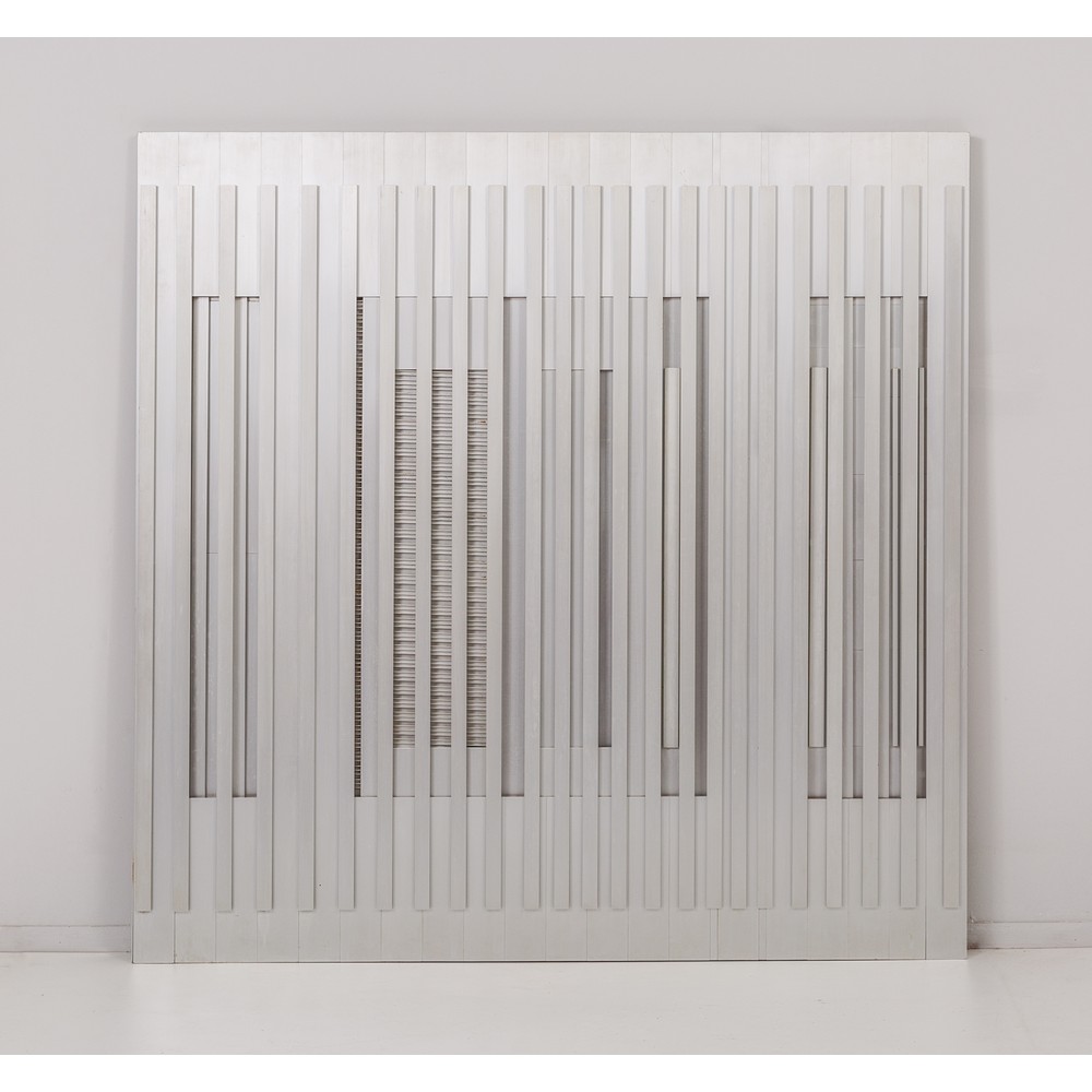 Grande installazione a pannello quadrato in legno rivestito da elementi geometrici e in lamina d'alluminio, opera sulla rifrazione delle onde sonore. Firma ‘Salvatore’ sul retro, insieme alla dicitura ‘DD878 Venezia’, trattandosi di un'opera probabilmente esposta alla biennale di Venezia.