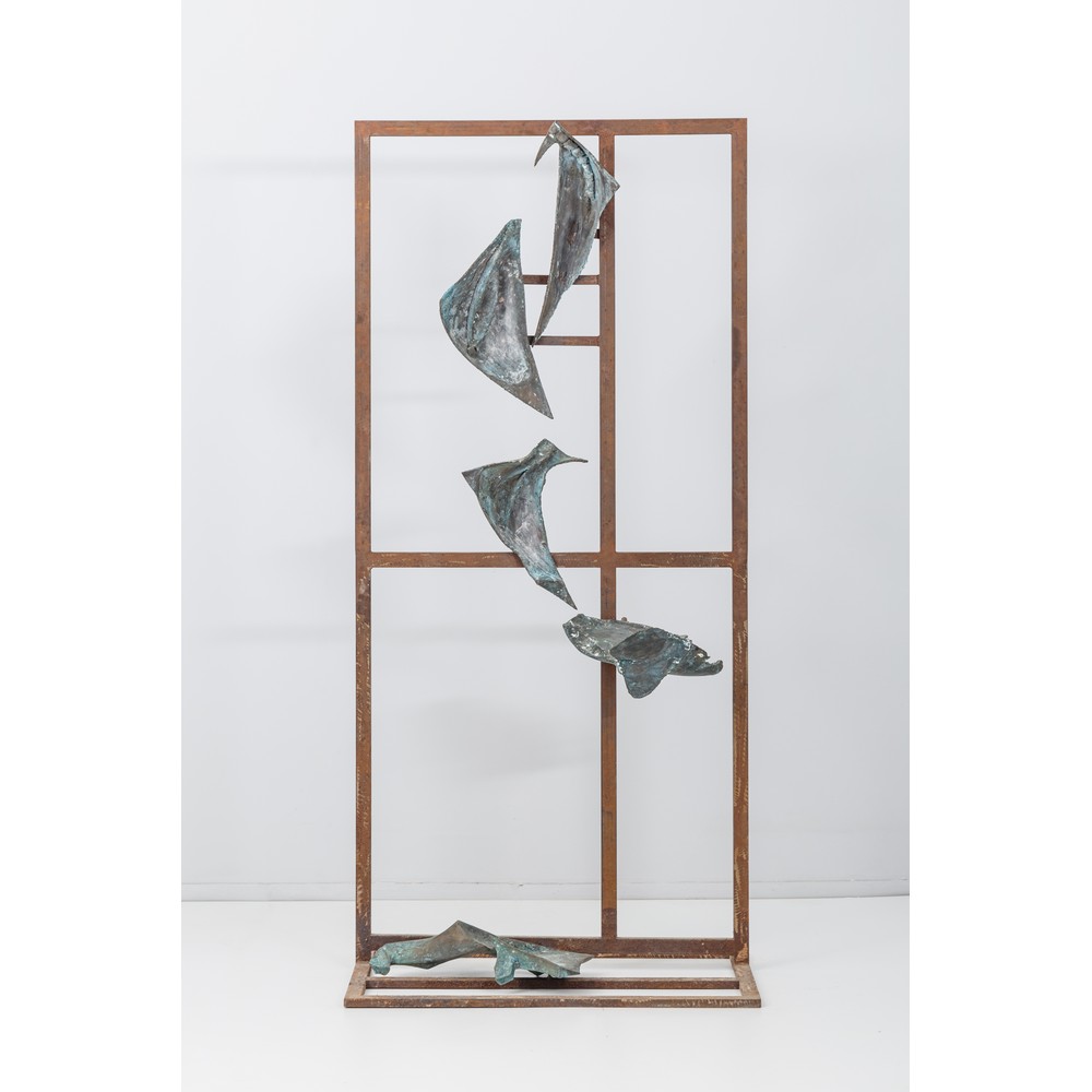 Scultura volume astratta in ferro naturale, applicazioni irregolari su struttura a telaio verticale, (probabilmente esposto alla Biennale di Venezia).