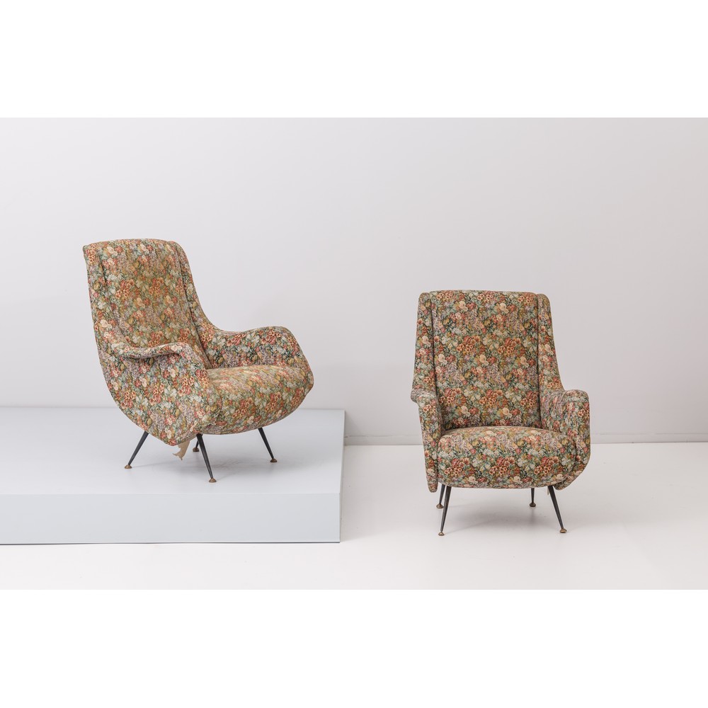 Coppia di poltrone struttura in legno con imbottitura e rivestimento in tessuto fiorato, piedi a spillo in metallo verniciato e ottone.