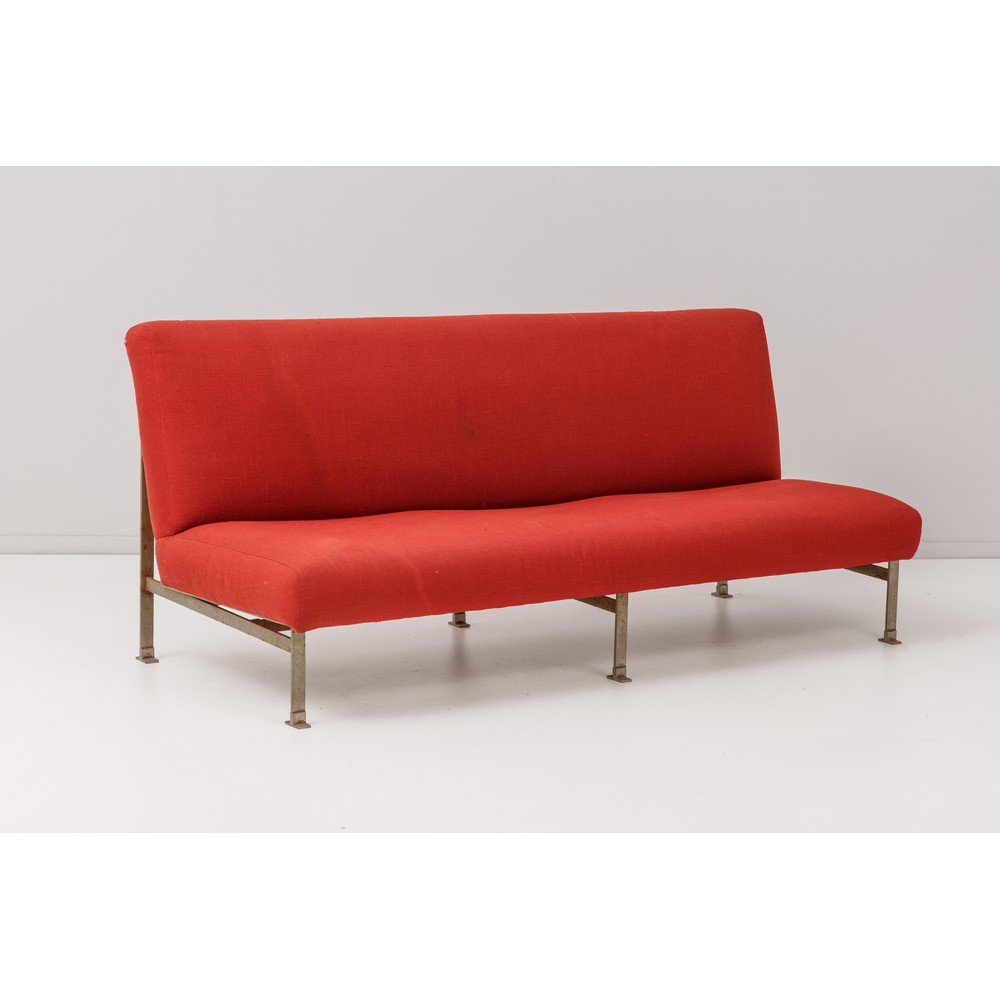 Divano a tre posti con struttura in ottone nichelato, piedi a ‘T’, spalliera e seduta con imbottitura e rivestimento in tessuto rosso. Presenti segni di usura.