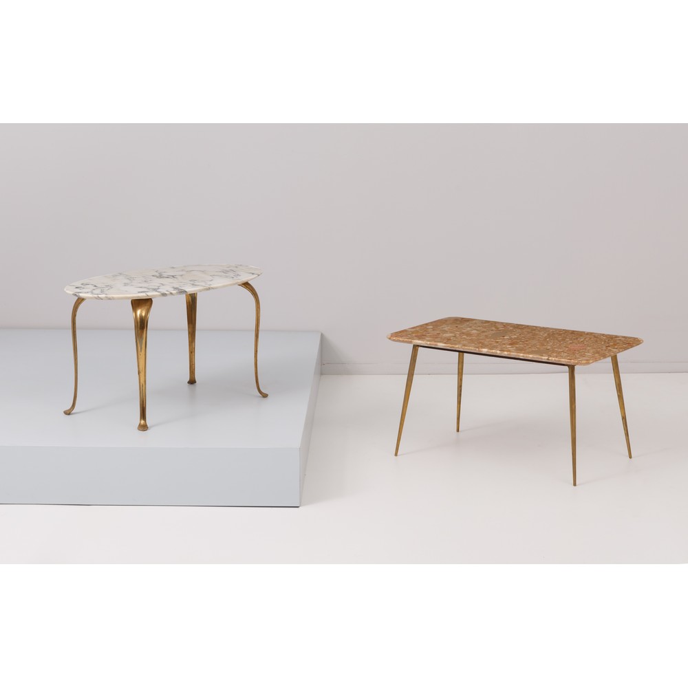 Due tavoli bassi in ottone, il primo con piano ovale in marmo e i piedi a ciuffio, il secondo con piano rettangolare in marmo e piedi a spillo.