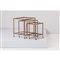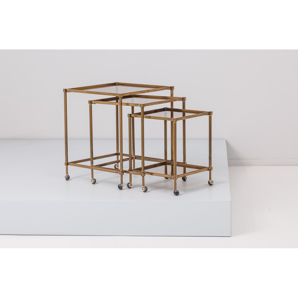 Tre tavoli ad incastro su ruote in ottone, piano rettangolare in vetro.