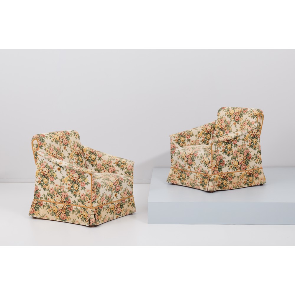 Coppia poltrone con imbottitura rivestite in tessuto in a motivi floreali, piedi in legno.
